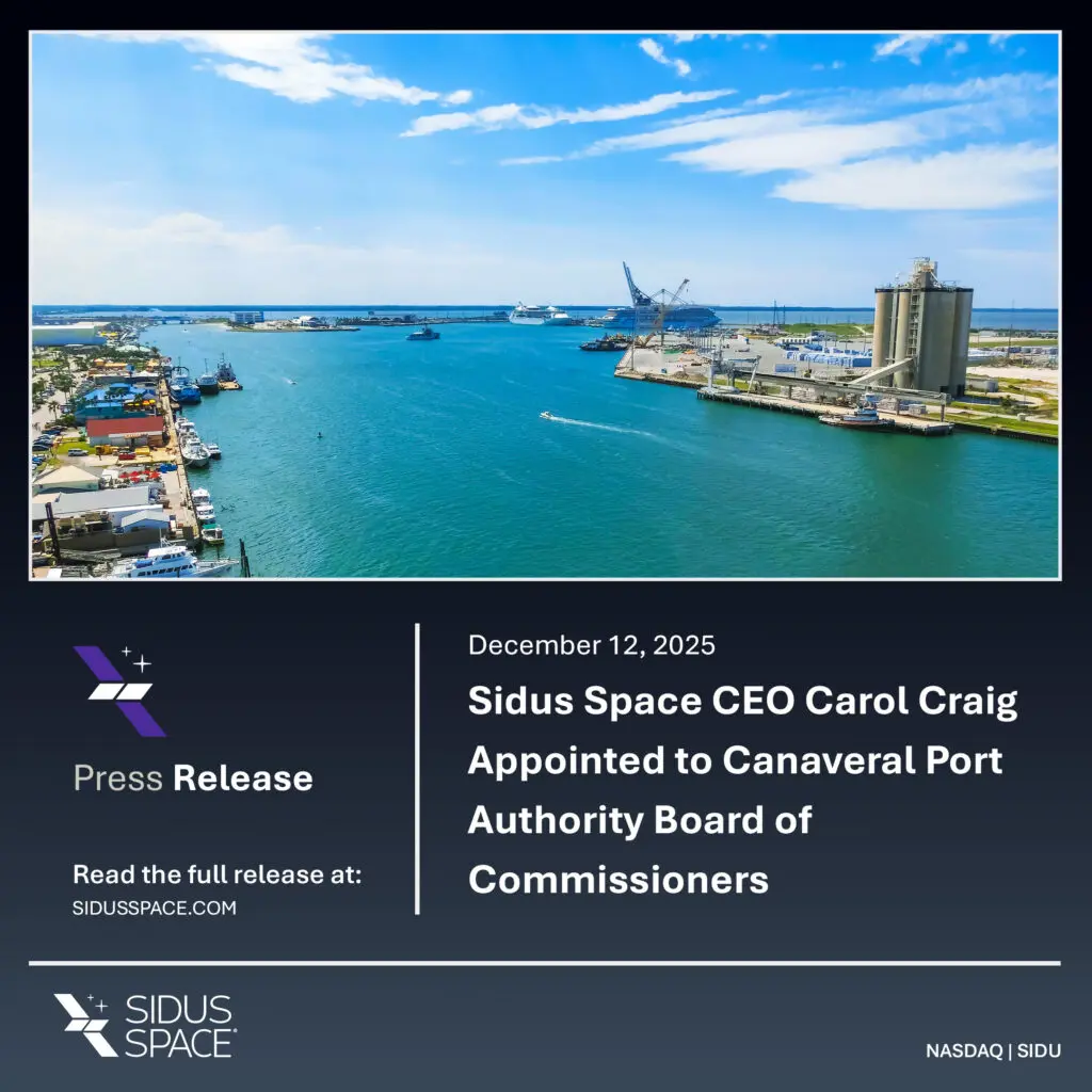Cape Canaveral, FL – December 12, 2025 – Sidus Space (NASDAQ: SIDU) (“Sidus” or the “Company”), an innovative space and defense technology company, today announced that its Founder, Chief Executive Officer, and Board Chair, Carol Craig, has been appointed by Florida Governor Ron DeSantis to the Canaveral Port Authority Board of Commissioners. Craig will serve […]
